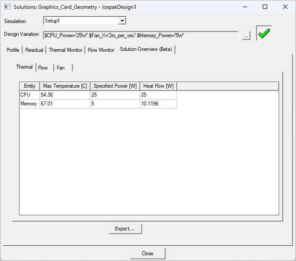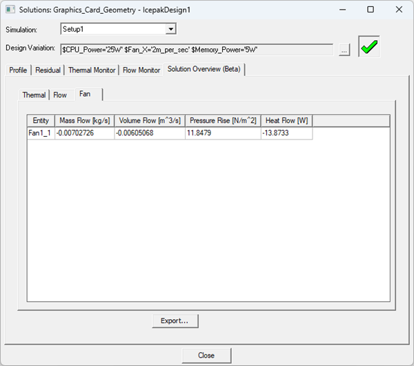The solution overview has three tabs that display thermal, flow, and fan data. Toggle between the Thermal, Flow, and Fan tabs to view the information. Click Export to generate a plain text (.txt) file containing the data. For parametric trials, click [...] next to Design Variation to open the Set Design Variation dialog box and choose the variation for which to display data.