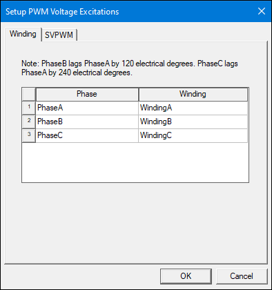 - In the Setup PWM Voltage Excitations window that opens, arrange the three windings to represent the three phase windings (PhaseA, PhaseB and PhaseC) accordingly.