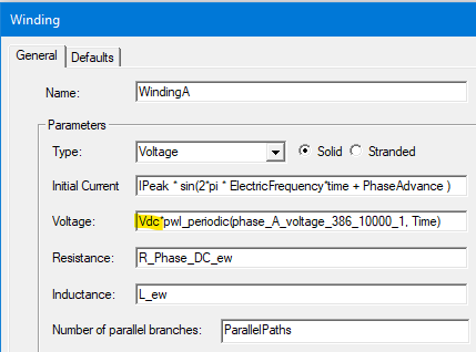 The phase datasets generated are added to the corresponding Winding Voltage value field in the format of pwl_periodic, which is used to ensure the voltage is periodic in case the simulation is longer than one electric cycle. WindingA is shown as an example: