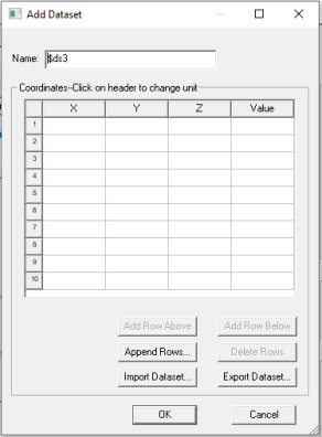 Check Use spatial dependent dataset. If a predefined dataset is available, you can select it. Or you can select Add/Import Dataset. This opens the Add Dataset dialog box for specifying 3D object coordinates and associated values of the material property (conductivity, permeability, or permittivity) to be used in the design. (You can click the column heads to select the units.)