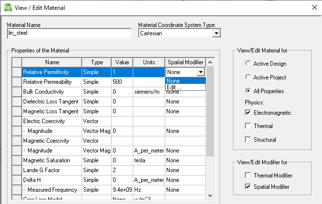 Maxwell magnetic transient solvers support use of a 3D Dataset as a Spatial Modifier to modify spatially varying properties of conductivity, permeability, and permittivity. In general, Thermal Modifier and Spatial Modifier cannot be applied to one material property simultaneously.
