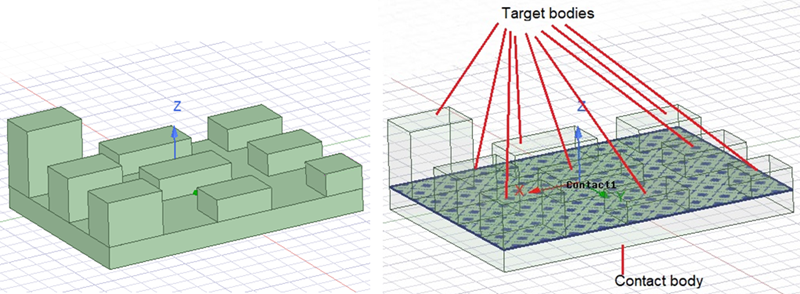 - Example 1: Multiple small bodies in contact with one larger body (for example multiple semiconductor dies on a common substrate):