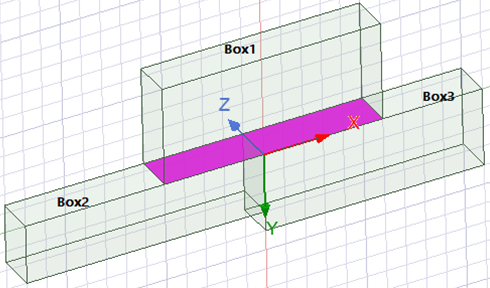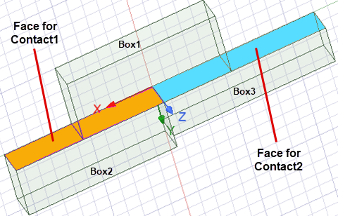 When the thermal resistance properties differ, assign contact separately to each of the non-common faces (top of Box2 and top of Box3 in this example) using either the Conductance per Area or Impedance option. Do not use the Thermal Conductance or Thermal Resistance option for this case, since the total contact area differs from the area of the selected face: