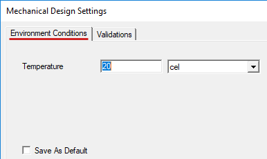 - EnvTemp, a predefined variable, which is the Temperature value defined in the Environment Conditions tab of the Mechanical Design Properties dialog box. This is the default value, but after defining a Thermal Condition, you can save a user-defined value as the new default.