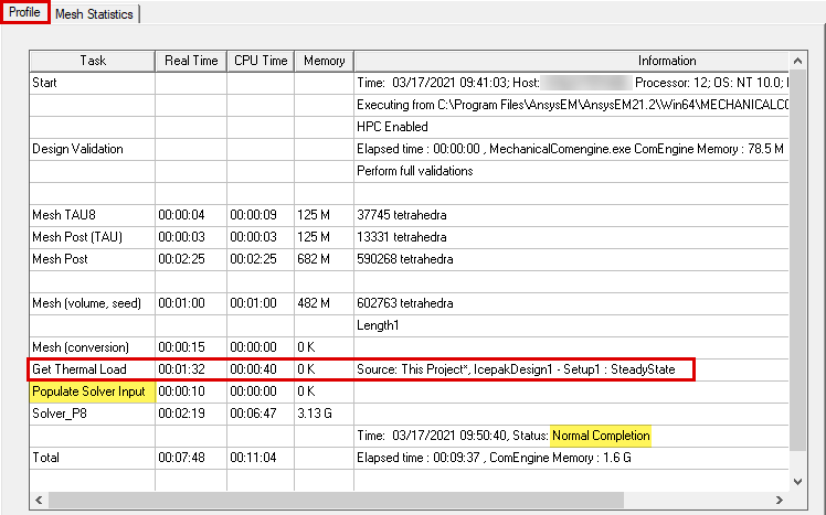 After Mesh (conversion), the Get Thermal Load process is listed, including the source project and source design information. This profile entry represents the temperature mapping process. When this step is successfully completed, it is followed by Populate Solver Input, and the solution proceeds:
