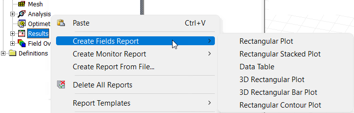 - Right-click Results in the Project Manager and choose Create Fields Report > desired display type:
