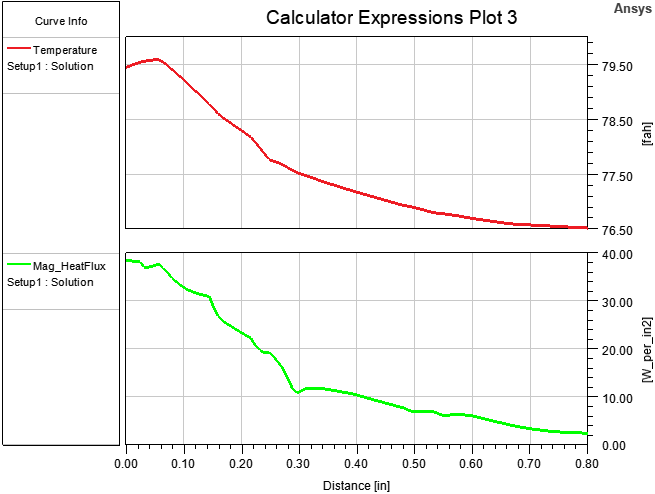 The following example is a stacked rectangular plot of the Temperature and Mag_HeatFlux results along Polyline1. The polyline was drawn from the center of a transistor/heat sink contact face to one of the bottom corners of the heat sink. The temperature and heat flux decrease with increased distance from the heat source: