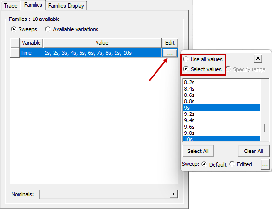- Optionally, if there are multiple design variants (such as in a Parametric analysis) or multiple time steps (in a transient solution), click the Families tab to choose the ones to plot. Then: