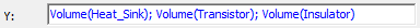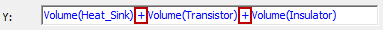 With the Volume of all three parts selected in the Quantity list of the Report dialog box, the semicolons in the Y text box were replaced with plus signs (+):