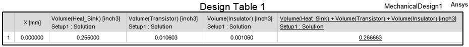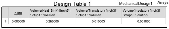 The following example is a data table listing the volume of the three objects comprising a model. It has been modified to show the volumes in cubic inches, and the columns have been reduced from their default widths: