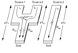 The resistance matrix gives the relationship between voltage drops and currents. For instance, the transmission structure shown below consists of two regular conductors, one of which has multiple sources of current.
