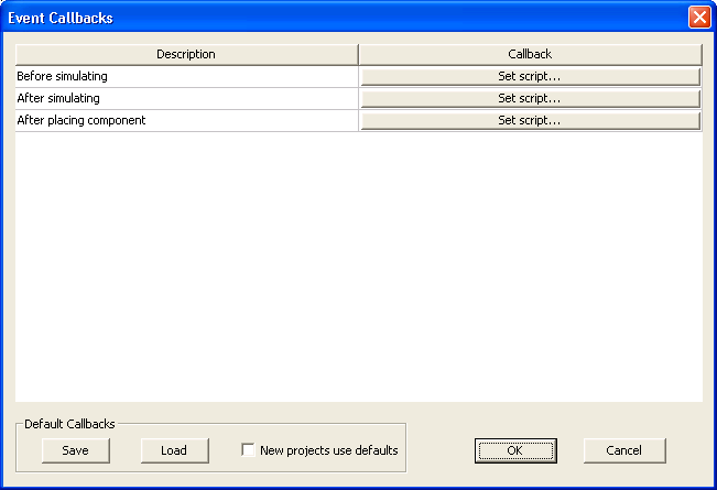 - New projects use defaults ensures that each time you select File > New, and each time you launch Twin Builder and a new project is created, the default Event Callback script settings are loaded and applied to the new project. Each script name setting is used to load the corresponding script into the project. If a particular script is not found, a warning message appears in the Message Manager pane. If this occurs, ensure that the library containing the script is configured before creating a new project.
