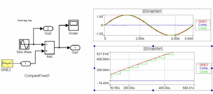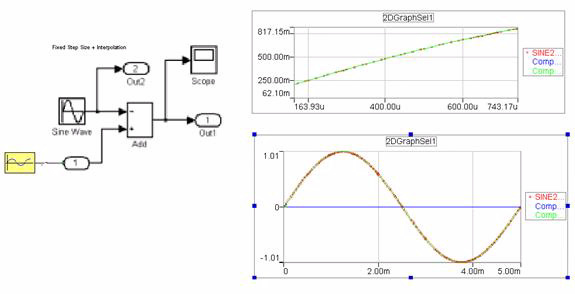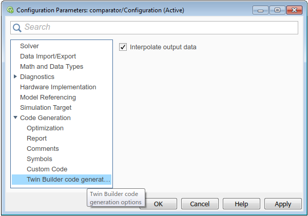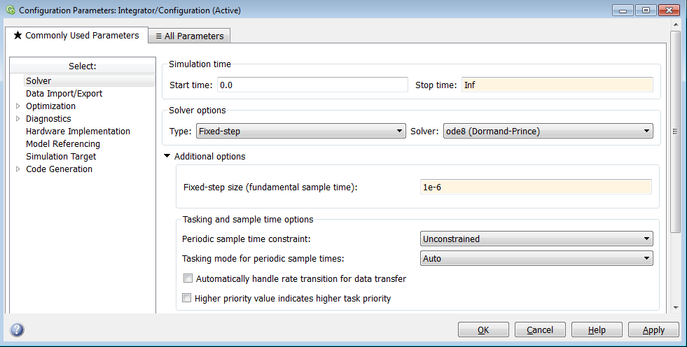 The solver must be set to a fixed type. If the stop (end) time is set to Inf, the model uses the Twin Builder end time. This option guarantees the most flexibility and should be used instead of a fixed end time. If you do set a fixed end time, the model output will be constant after that time is passed. The fixed step influences the maximum integration time in Twin Builder. Twin Builder synchronizes to these time points. A small sample time here could slow down the simulation dramatically. This time should not be too large because between two samples, the output of the Simulink model is constant. A value change on an input port is not recognized by the Simulink model between two samples. The step size should be a compromise between accuracy and speed.