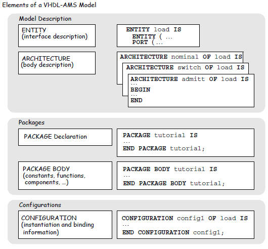 An entity normally consists of five basic elements, or design units: entities, architectures, packages, package bodies, and configurations. Entities and architectures are the only two design units that must exist in any VHDL-AMS design description. Packages and configurations are optional.