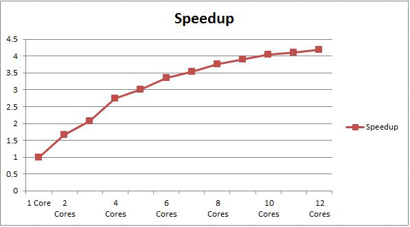 Here is a graph showing the speedup of the causality checker using multithreading on this 278-port file. The plot is generated using data from runs with 1, 2, 4, 6, 8, 10, and 12 cores, then averaging the known times to approximate the speedup for 3, 5, 7, 9, and 11 cores. The speedup for N cores is the time with one core divided by the time with N cores.