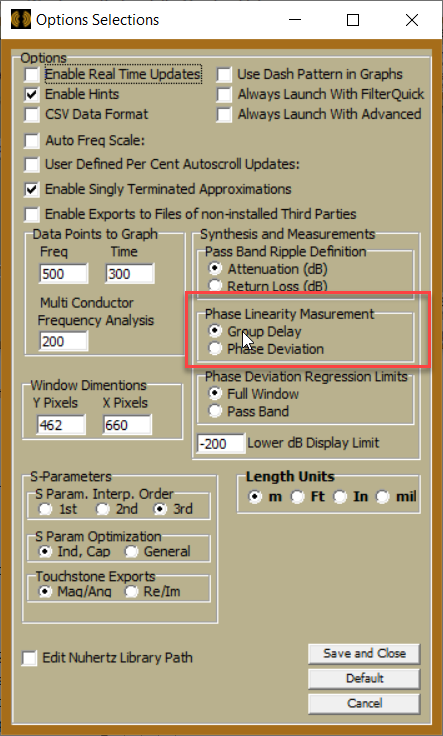 In the Options Selection menu (Step 3), the Phase deviation option limits are selectable, full graphical window being the default. If it is desired to limit the frequency range to the frequencies desired to be linear, this default selection works. If a broader range of frequencies is desired to be viewed, then it may be necessary to limit the linear regression to just the passband. When setting limits to just the passband it is usually desirable to also set the phase deviation measurement limits using the "Limits" selection in the frequency response graphical window to zero in on the phase deviation for the desired frequencies and exclude phase deviation elsewhere.