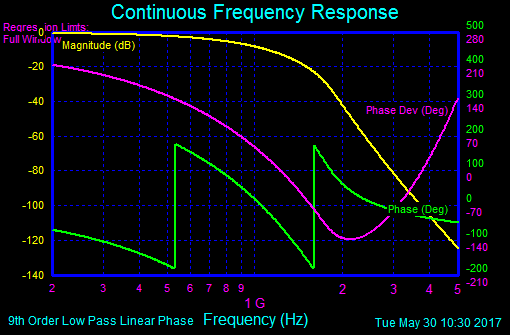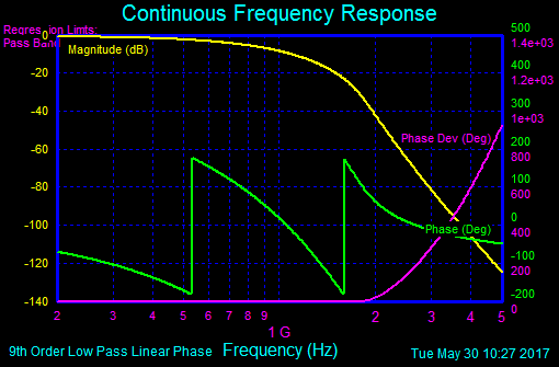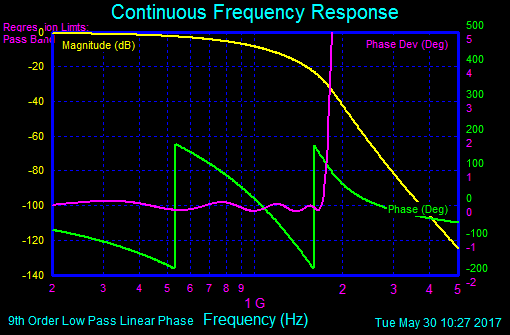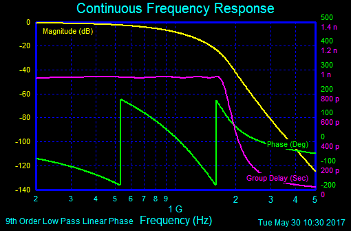 The frequency response of a 9 pole Linear Phase filter with 1% group delay ripple is shown below in Figures 1A, 1B, 1C, and 1D with the various described methods of viewing the quality of linear phase.