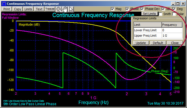 If it is desired to limit the phase regression to something other than the pass band or graphical window, Advanced Panel frequency response windows permit the selection of customized regression limits by selecting the "Set Limits" button the upper right, as shown in Figure 2.