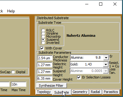 Nuhertz project via elements that attached to the lower and sometimes upper ground plate are included in all FilterSolutions project exports that contain such vias, including for suspended and inverted substrates. This via grounding through an air layer simulates properly, but the physical construction of the design may have to be physically implemented as a ground plane or box wall.