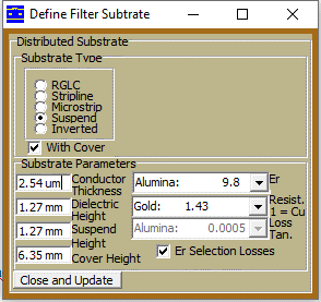 The Substrate Definition panel will appear as shown below in Figure 2. Select the topology desired, layer dimensions, and materials, and then Close and Exit. Dielectric and conductance values may be entered with a numerical text entry, if desired. i.e., "4.56" for a dielectric constant or conductance of 4.56. Dielectric name may be entered with a name, colon, and number. For example, "MyDielectric:6.78" will create a dielectric name of "MyDielectric" and a dielectric constant of 6.78. At export time, HFSS 3D stack up is created in Overlap mode that conforms to the substrate definition.