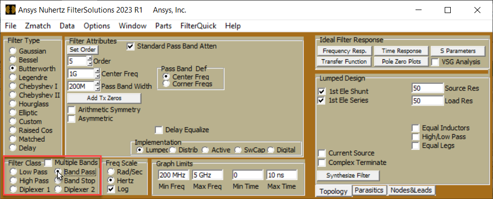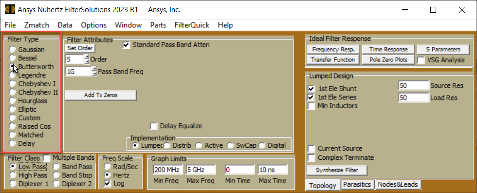 Stop band filters of Chebyshev II, Hourglass, and Elliptic may have their high pass and low pass leg stop bands set individually by selecting the respective "Low Stop Ratio" and "High Stop Ratio" text entries. In the case of Elliptic filter, the stop band attenuation may be selected independently for both high pass and low pass legs.