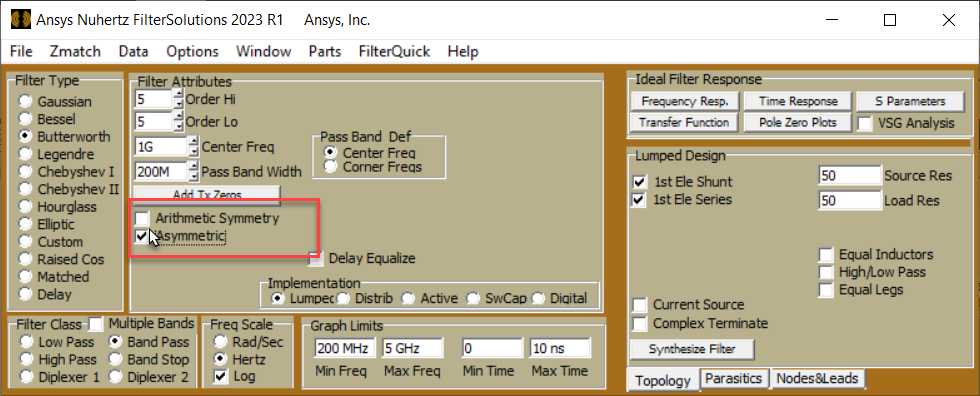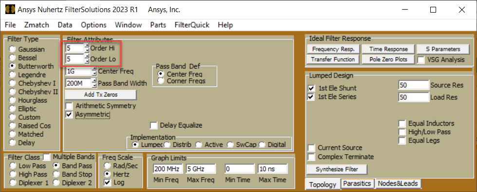 Asymmetrical filters are band pass filters are created using a different orders for the high pass and low pass parts of the filters. In the case of Chebyshev I1, Chebyshev II, Hourglass and Elliptic filters, the low pass and high pass orders must both be odd in order to implement with passive or tx line filters.