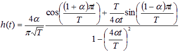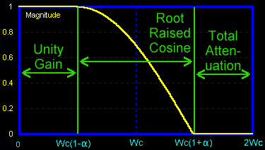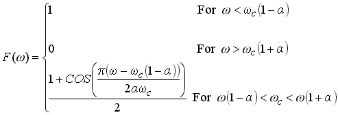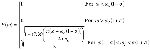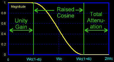 The ideal raised cosine filter frequency response consists of unity gain at low frequencies, a raised cosine function in the middle, and total attenuation at thigh frequencies. The width of the middle frequencies are defined by the roll off factor constant Alpha, (0<Alpha<1). In FilterSolutions, the pass band frequency is defined as the 50% signal attenuation point.