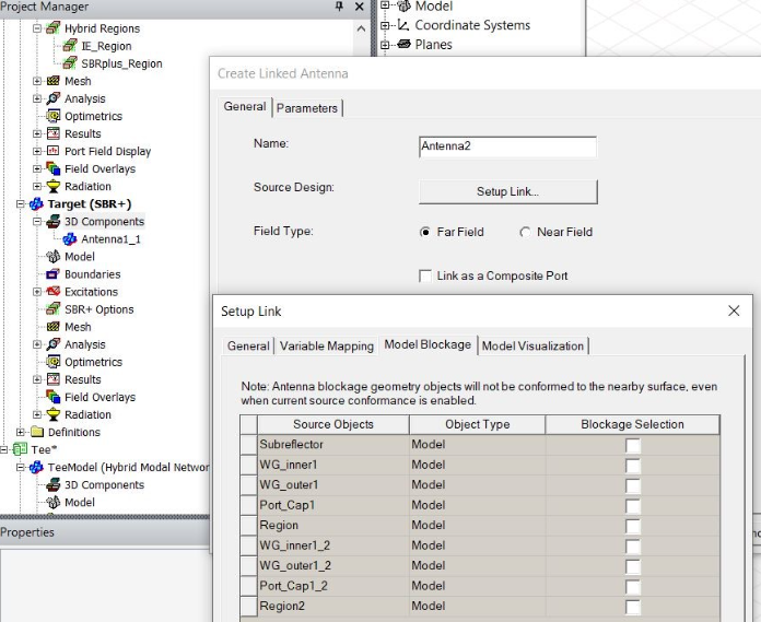 For this release Model blockages can handled as a separate step outside creation of the linked design, by selecting geometry from the SBR+ region to be designated as “Model Blockage” associated with a particular source antenna, as described in the Section "Configure Simulation with SBR+ Antenna Geometry Blockage (HFSS with Hybrid and Array Solution Type)" in Assigning SBR+ Hybrid Regions.