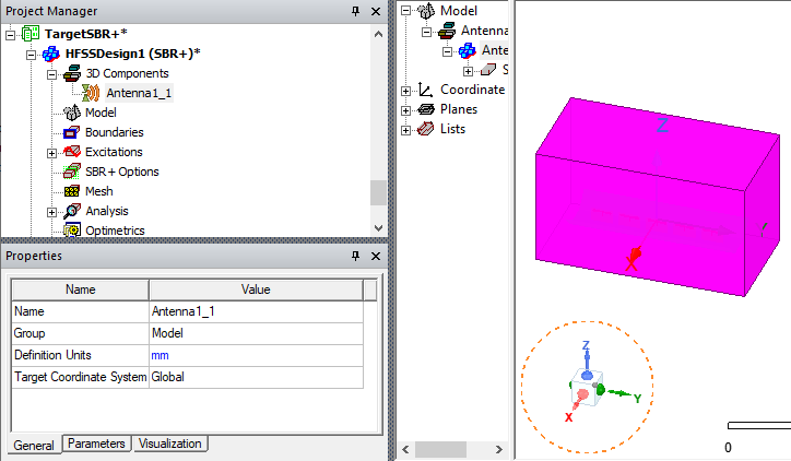- Select the 3D Component for the source antenna in the target Project tree to view the properties.