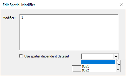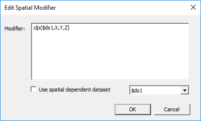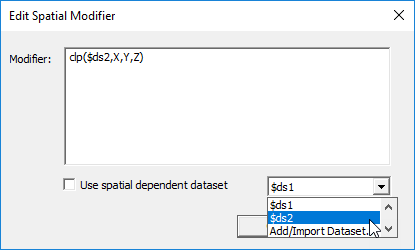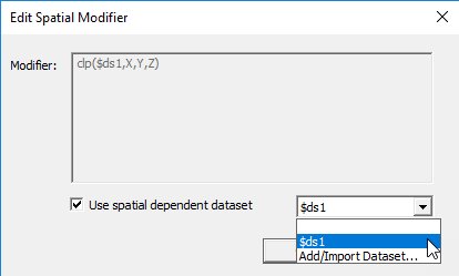 If you check, Use spatially dependent dataset, the field is grayed out and a menu lets you select $ds1 or Add/Import Dataset... . If you select $ds1, the grayed out field shows the modifier as clp($ds1,X,Y,Z).