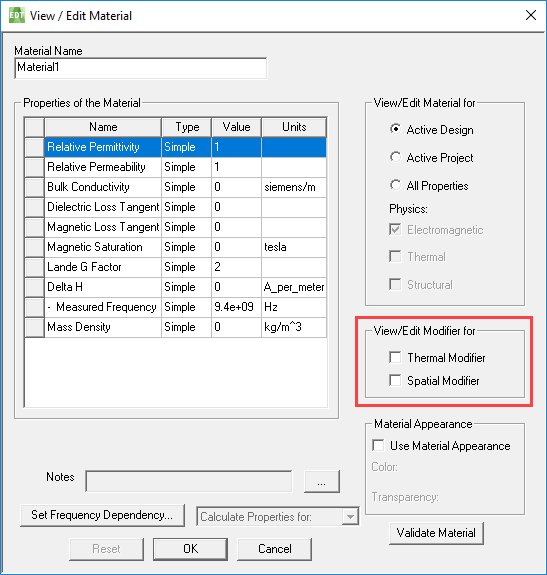 Support for 3D Spatial Modifier Dataset Material Property in HFSS