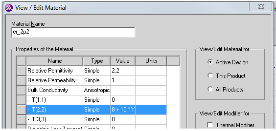 So, the Bulk Conductivity could be something like 300 + 10 * Y to show increasing conductivity over the length of the object. Of course, the entire expression language is available so more complicated functions are usable as are project variables. Design variables are not supported at this time.