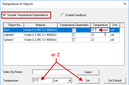 - In the Temperature column for all objects using the material Water 0.2-35C 0.1-400GHz, specify the object temperature in your preferred units.