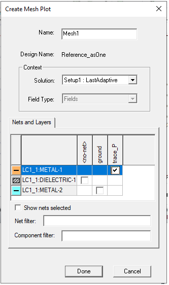 After making selections click Done. The mesh plot will be generated on the objects belonging to the selected layer/net combinations.