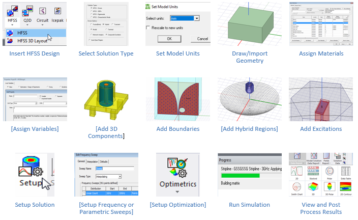 To set up an HFSS design, follow this general procedure. After you insert a design, you do not need to do the optional steps nor perform the intermediate steps sequentially, but you must complete them before you generate a solution.