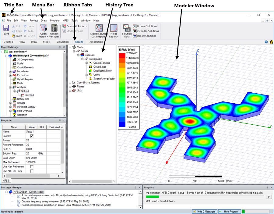 The Menu Bar is located near the top of the GUI. It consist of a group of menu commands arranged by category such as File, Edit, Project, Draw, Modeler, HFSS, Tools, etc. The Ribbon contains frequently used commands arranged into Tabs of logically related functions such as View, Draw, Model, Simulation, Results, and more. Commands for all operations in HFSS are accessible from the items and buttons in the menus and ribbon tabs. You can also right-click in the appropriate window or on Project Manager entries to perform desired operations.