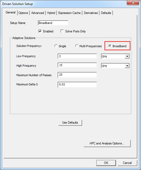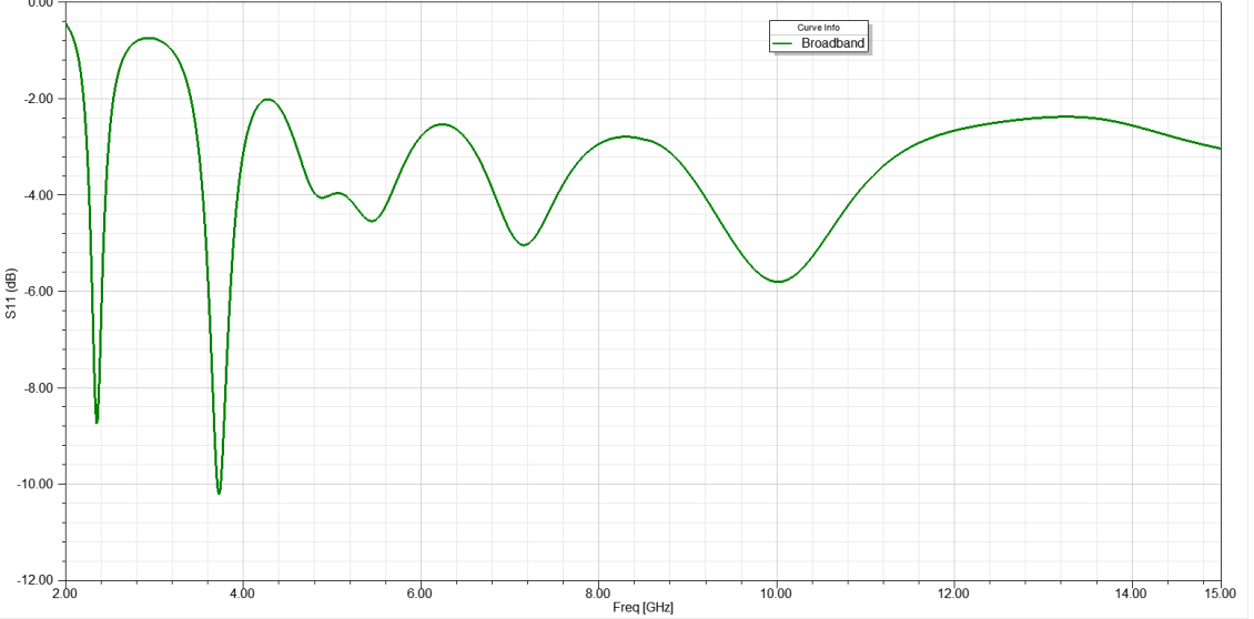 The return loss after running the broadband solution frequency setup simulation is shown in the following figure.