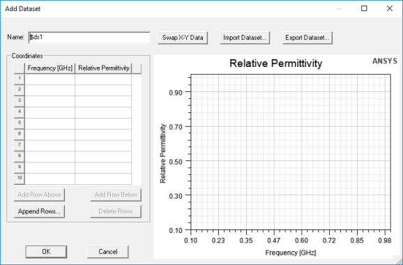 - Coordinates – contains a table that allows you to specify the Frequency (in GHz) and the specified material property's value at that frequency. Enter the data into the table manually, or click the Import Dataset button to populate it from a *.tab file.