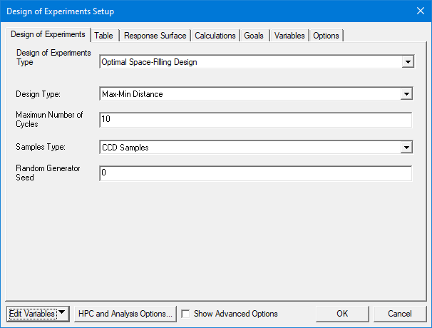 There are a wide range of DOE algorithms or methods available in engineering literature. These techniques all have one common characteristic: they try to locate the sampling points such that the space of random input parameters is explored in the most efficient way, or obtain the required information with a minimum of sampling points. Sample points in efficient locations only reduce the required number of sampling points and increases the accuracy of the response surface generated. For more information on the available types of DOE, see Design of Experiments Types.