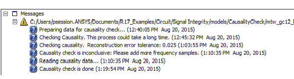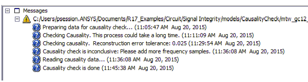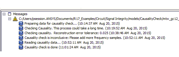 Multithreading can save significant time in the causality check calculation, especially for data sets with large number of ports or a large number of frequencies. The Network Data Explorer contributes a fixed amount of overhead time in preparing the data, and this overhead is not reduced by multithreading. Here are the messages from the causality check of a 278-port Touchstone file using two cores.