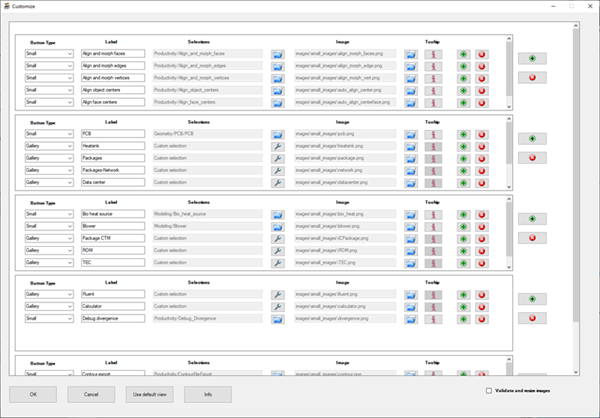| OK/Cancel/Use default view/Info | Click OK to save your changes and close the dialog box. Click Cancel to close the dialog box without saving. Click Use default view to restore the default selections. Click Info to display image size requirements for each Button Type. |
