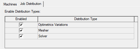Use the check boxes to enable/disable available distribution types. The job distribution list box allows you to specify which job distribution types to allow for the current analysis configuration. At solve time, the Ansys Electronics Desktop automatically select the best distribution type from the enabled distribution types. By enabling/disabling distribution types, you can control the job distribution.