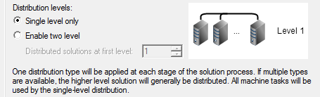 If you select single level, one distribution type will be applied at each stage of the solution process. If multiple types are available, the higher level solution will generally be distributed. All machine tasks will be used by the single-level distribution.