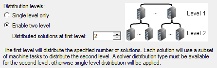 If you select Enable two level, the first level will distribute the specified number of solutions. Each solution will use a subset of machine tasks to distribute the second level. A solver distribution type must be available for the second level, otherwise single-level distribution will be applied.