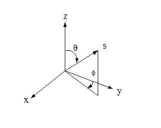 solid angles of extent, called control angles. The angles are the polar and azimuthal angles respectively, and are measured with respect to the global Cartesian system (x,y, z) as shown in The Angular Coordinate system, shown below. The theta and phi extents of the control angle, are constant. In two-dimensional calculations, only four octants are solved due to symmetry, making a total of directions in all. In three-dimensional calculations, a total of directions are solved. In the case of the non-gray model equations are solved for each band.