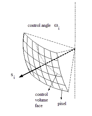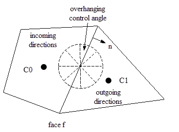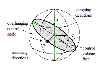 The control volume face cuts the sphere representing the angular space at an arbitrary angle. The line of intersection is a great circle. Control angle overhang may also occur as a result of reflection and refraction. It is important in these cases to correctly account for the overhanging fraction. This is done through the use of pixelation.