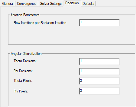 The energy contained in each pixel is then treated as incoming or outgoing to the face. The influence of overhang can thus be accounted for within the pixel resolution. Icepak allows you to choose the pixel resolution. For problems involving gray-diffuse radiation, the default pixelation of 1 X 1 is usually sufficient. For problems involving symmetry, periodic, specular, or semi-transparent boundaries, a pixelation of 3 X 3 is recommended. For problems involving inclined or curved surfaces, a minimum pixelation of 3 X 3 is recommended. You should be aware, however that increasing the pixelation adds to the cost of computation. The pixel resolution is specified in a solution setup with Theta Pixels and Phi Pixels on the Radiation tab. In the following example, a 3 X 3 pixelation is specified.