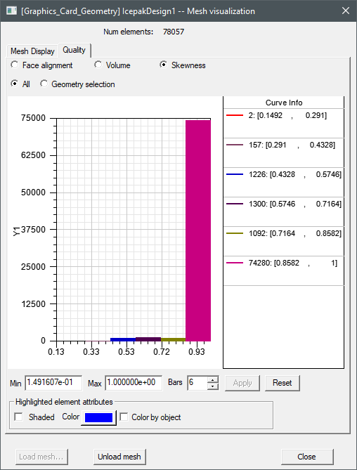 To view the elements of the mesh within a particular range of skewnesses, click on a bar in the histogram or a range in the Curve Info legend. Icepak displays the elements in the selected range in the 3D Modeler window. Select the Shaded option if you want to view these elements with solid shading. Click Color and select a desired color if needed.