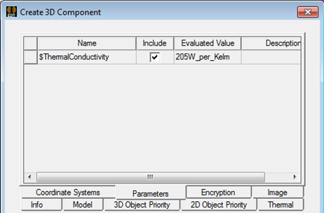 Component properties can be parameterized by assigning variables. The parameters list is populated with all the variables used by objects and coordinate systems, design data, and material properties included in the component.