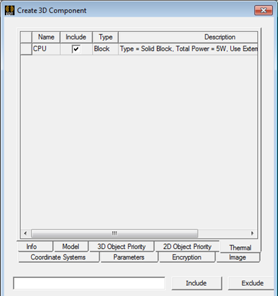 On the Thermal tab you can view a list of thermal boundary conditions assigned to the geometry selected to create the 3D component. Use the check box to Include or Exclude variables. You can also use the text field and Include/Exclude buttons.